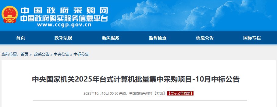 2025 年 10 月 16 日,中央国家机关 2025 年台式计算机批量集中采购项目中标公告正式发布。此次采购项目预算金额高达 3097.5 万元,吸引了众多知名计算机厂商参与竞争。